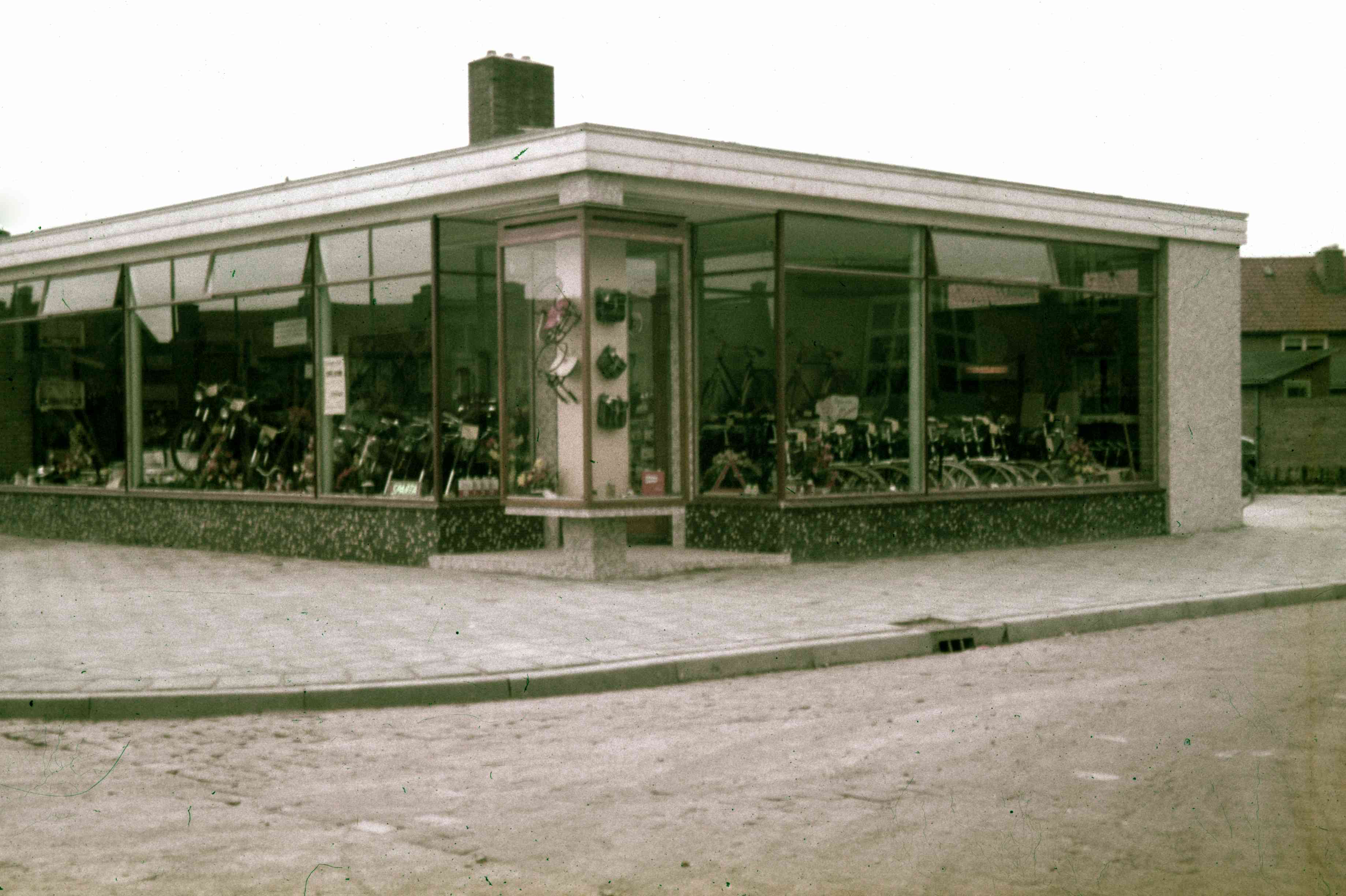 Fietsenwinkel op de hoek van de Kromme Nering met waarschijnlijk Het Achterom in …