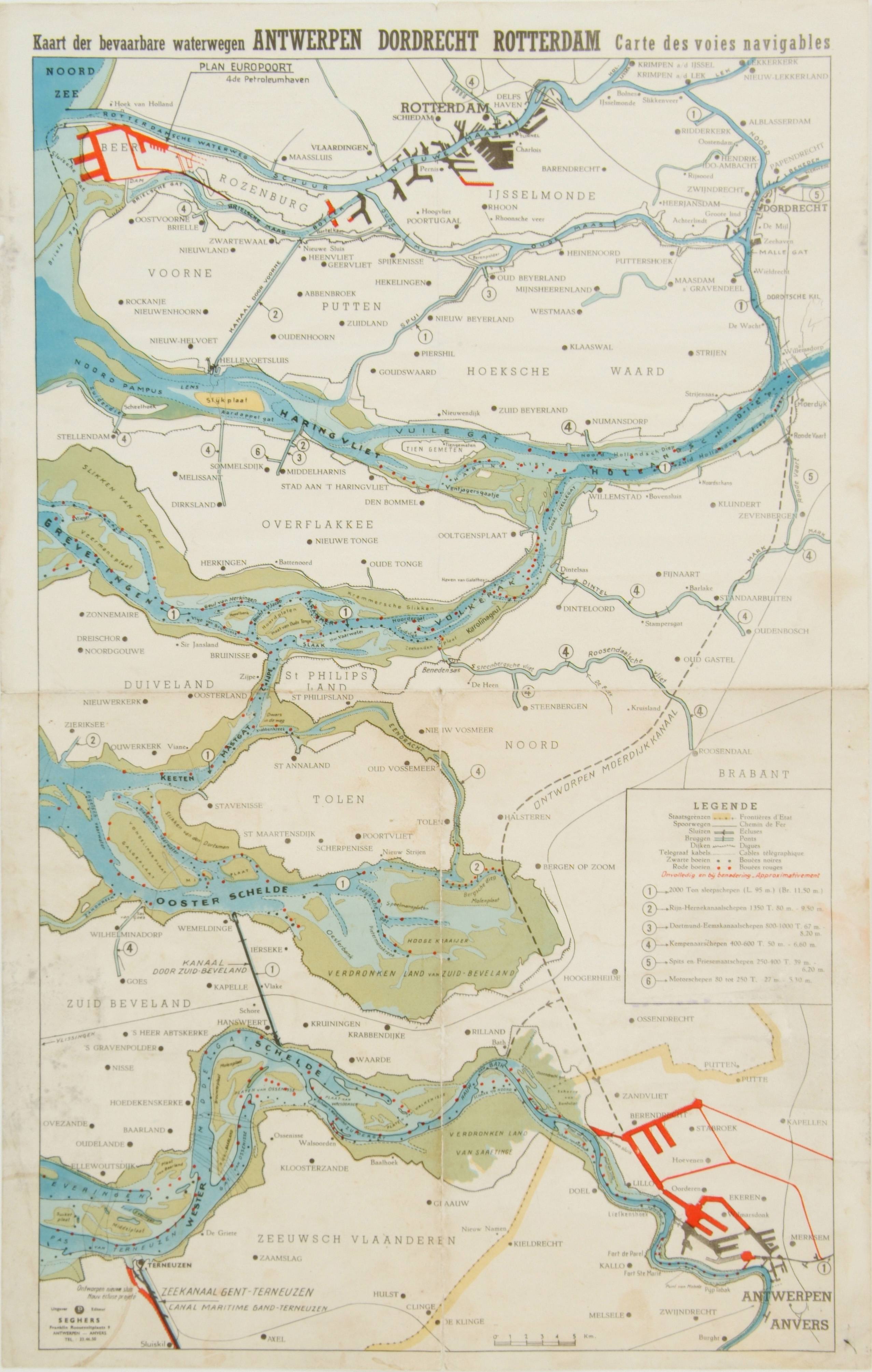 Kaart van de bevaarbare waterwegen tussen Antwerpen, Dordrecht en Rotterdam.