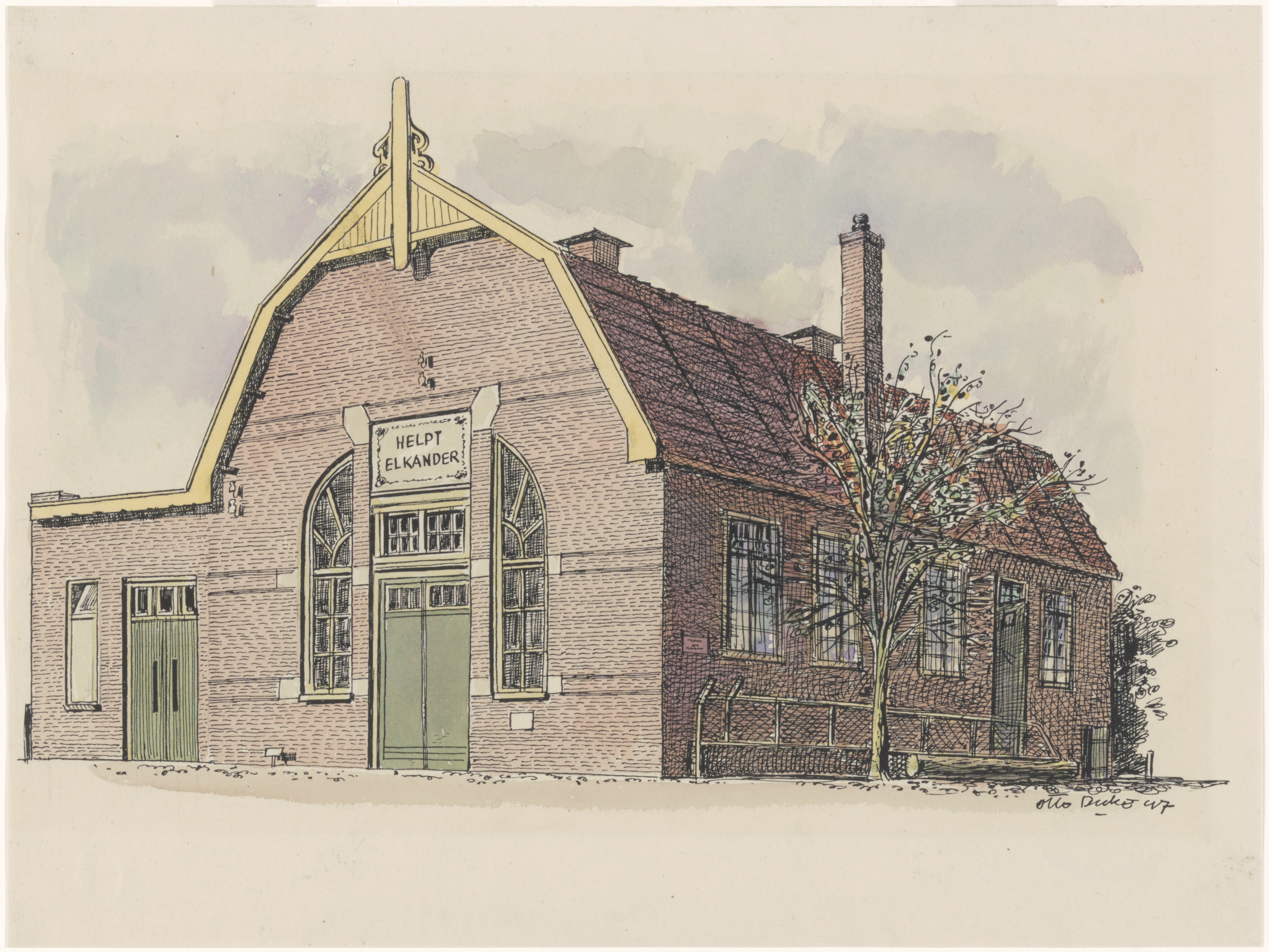Tekening van gebouw Helpt Elkander aan de Oudendijk tussen de Burgemeester Jaslaan en de Stevensweg.