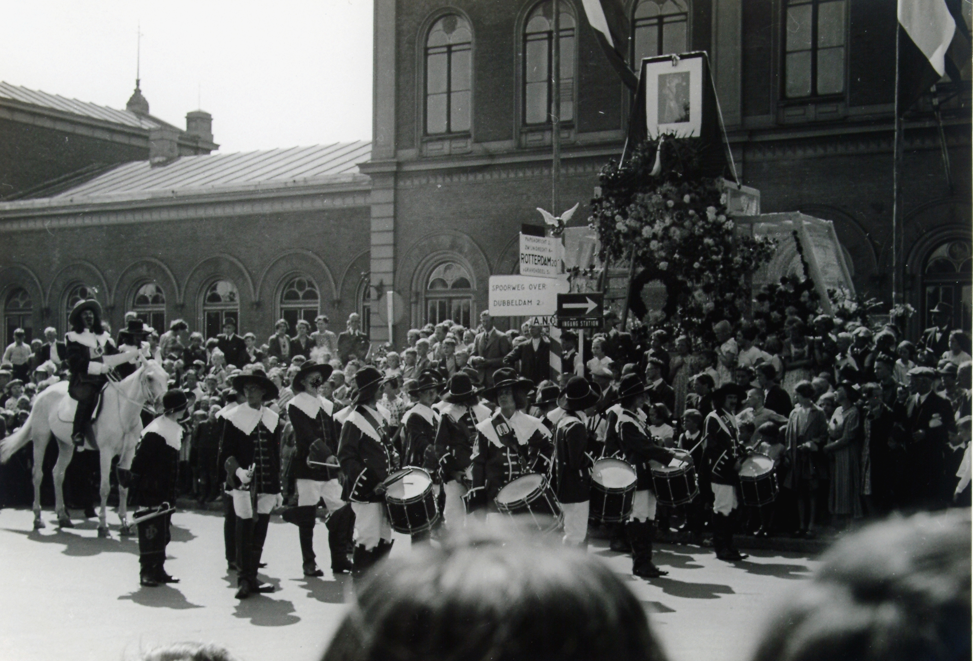 - bloemen / planten feestelijkheden geboortes muziekkorpsen publiek / toeschouwers richtingborden / wegwijzers stations(gebouwen)