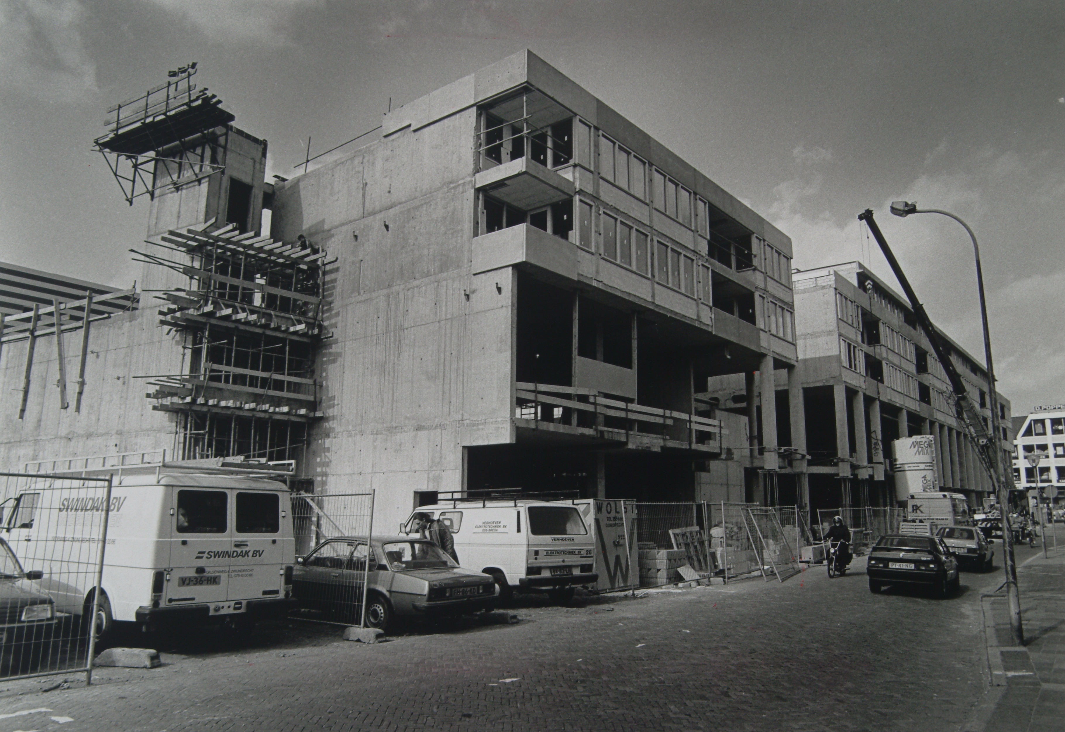 Bouw van winkelcentrum Drievriendenhof gezien vanaf de Kolfstraat