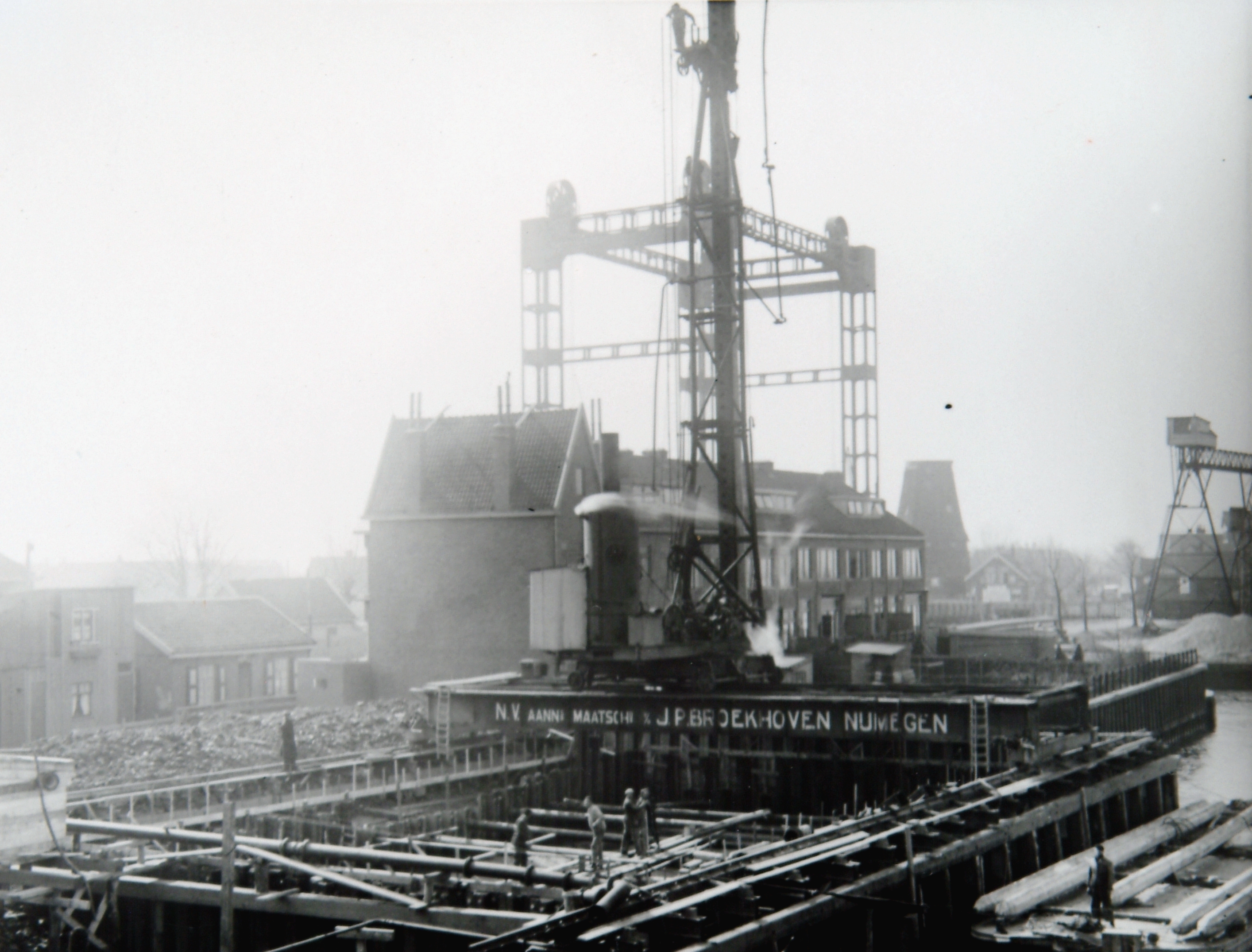 - Werkzaamheden aan de landingssteiger voor de verkeersbrug over de Oude Maas. De heistelling staat bij de Dokweg ten noorden van de Dokbrug. Het restant van de molen staat op de hoek van de Weeskinderendijk.