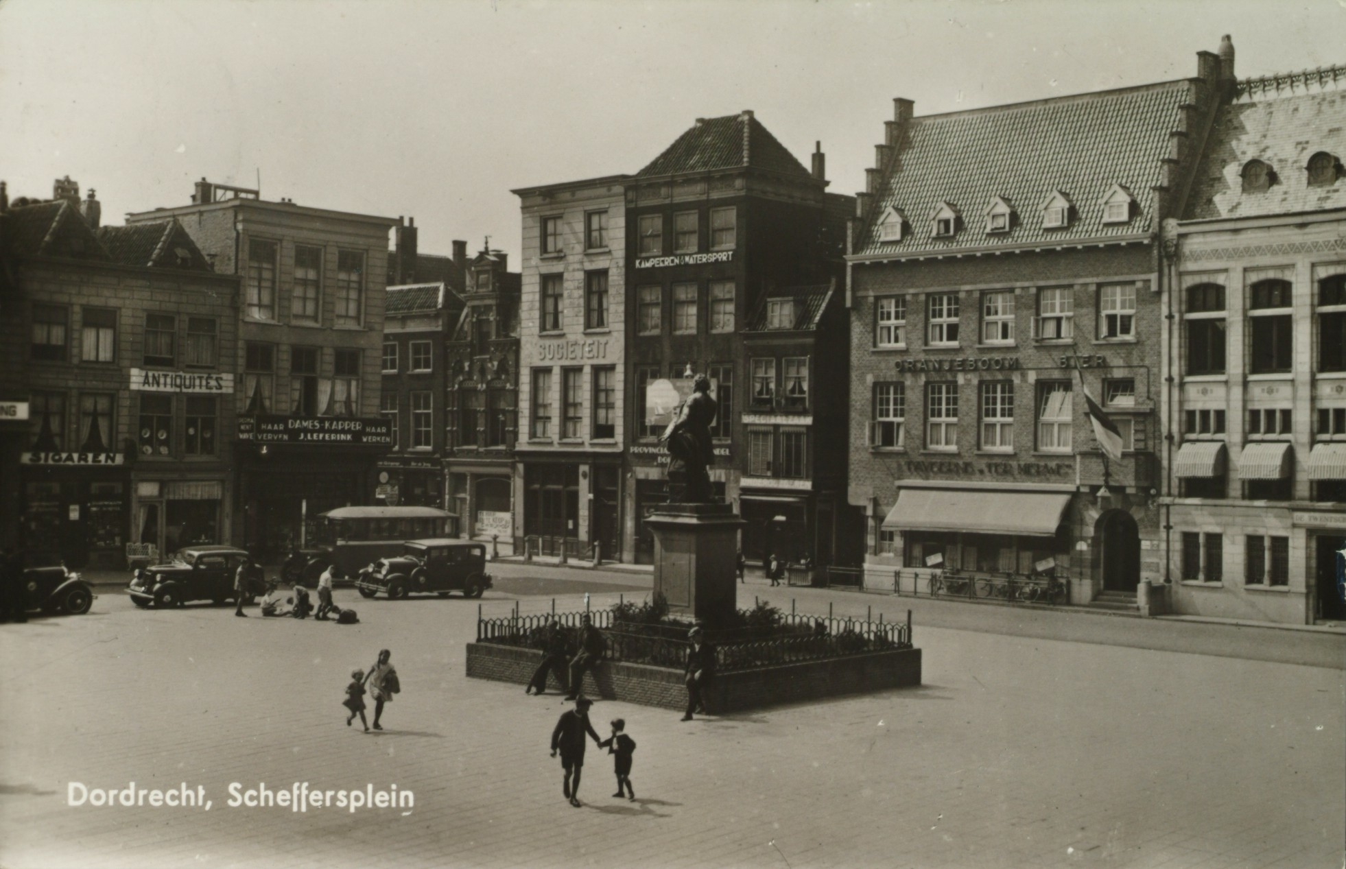 - Het Scheffersplein met het standbeeld van Ary Scheffer. Links het begin van de Groenmarkt, Centraal de Tolbrugstraat