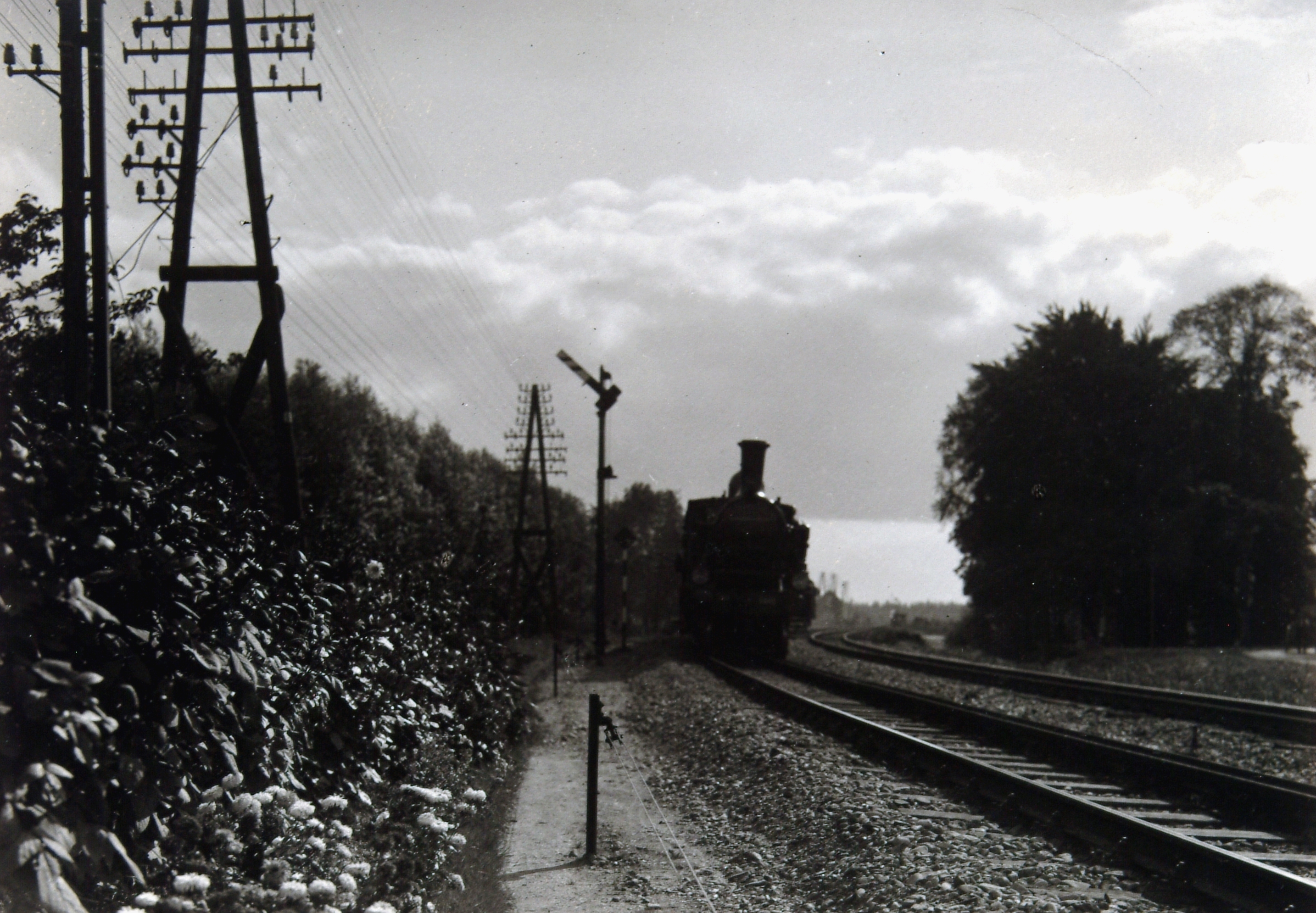 - Gezicht op de spoorlijn Dordrecht - Breda, gezien vanaf de Dubbeldamseweg naar de toenmalige Achterweg. Op het spoor is een locomotief en langs het spoor zijn elektriciteitsmasten.