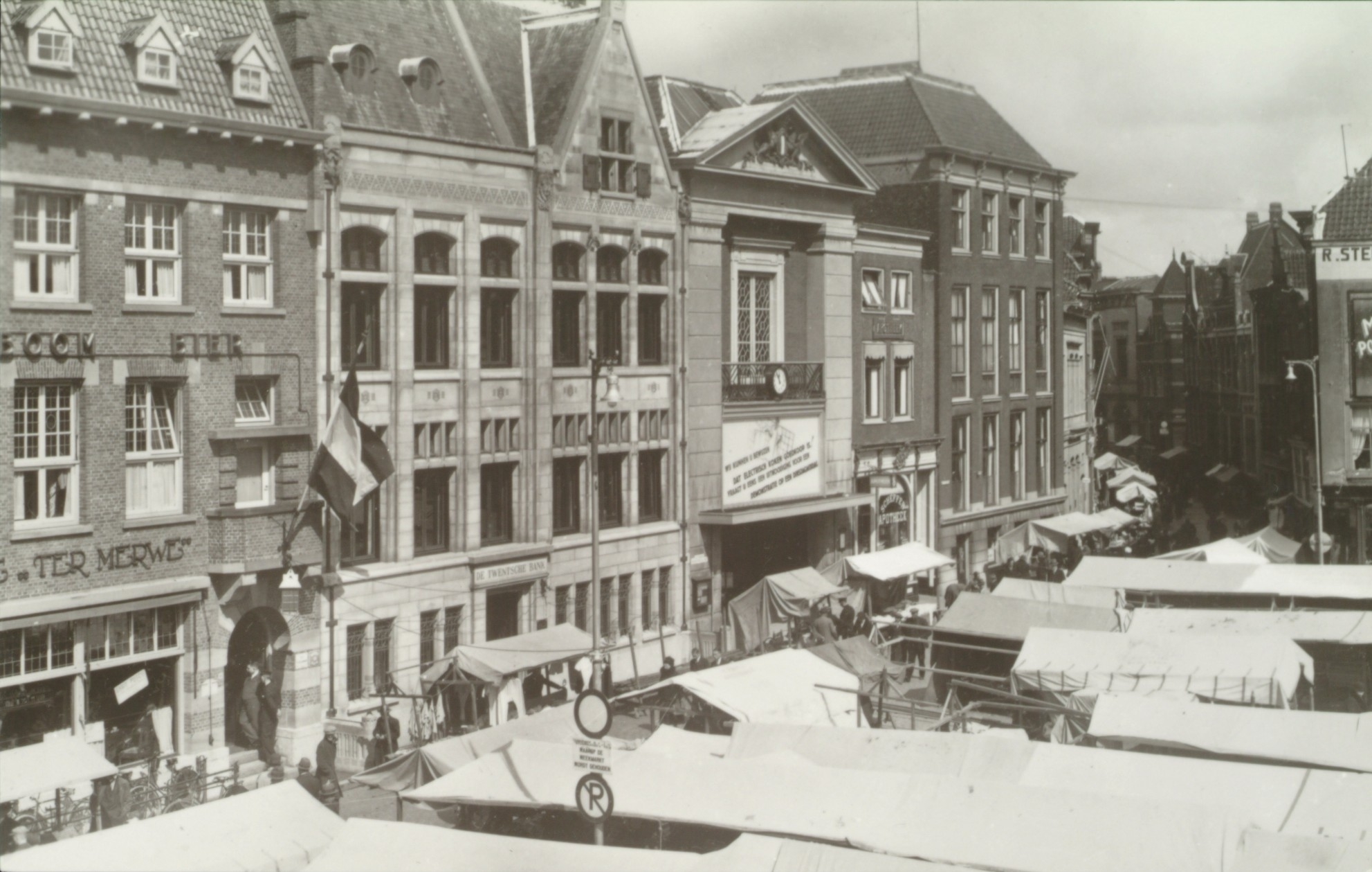 De weekmarkt op het Scheffersplein, gezien richting Wijnstraat. Omstreeks 1935 Foto J. …
