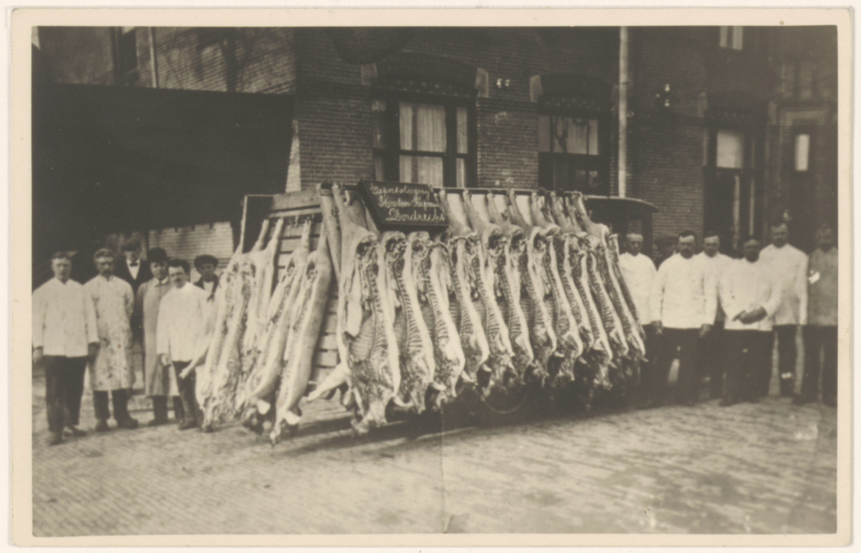 - Personeel bij een kar met geslachte varkens bij het slachthuis aan de Markettenweg.